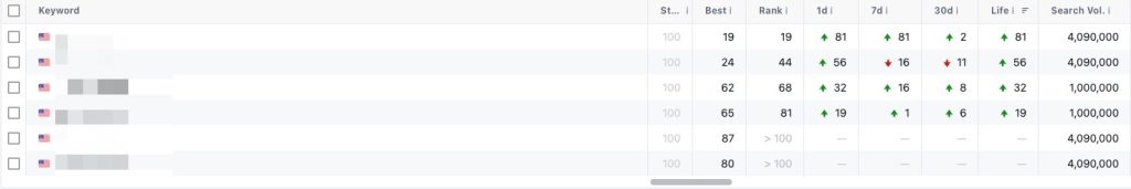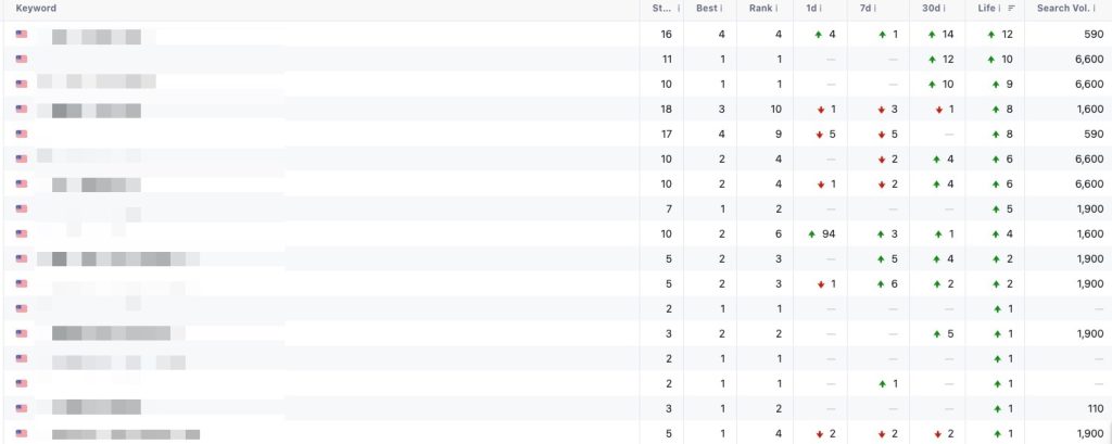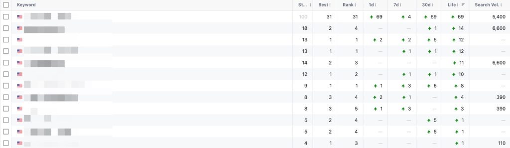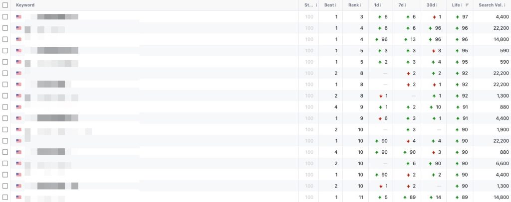 Some up and some down over the past 30 days as is typical with some dancing, but notice the start rank. All except 1 of the 14,800 keywords wasn’t even in the top 100 when the campaign started in January.